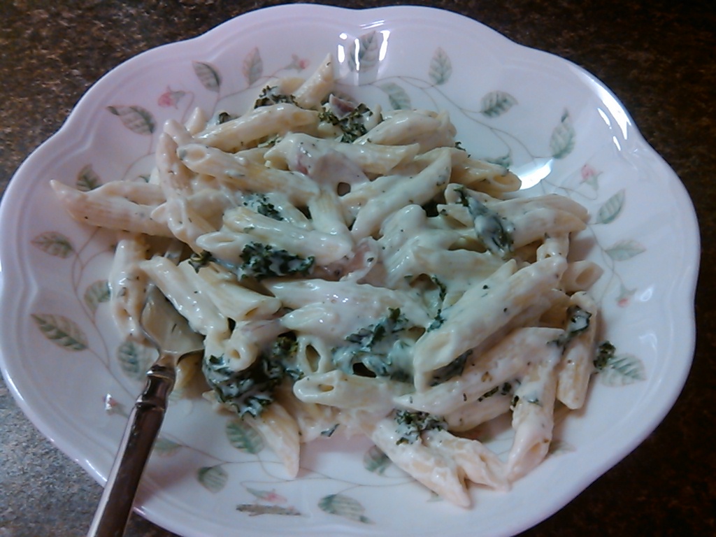 Last weekend I decided to make Spinach Alfredo for dinner.  I don’t follow an exact recipe; it’s usually something I make when I realize we have milk and/or cream that needs to be used up.  We didn’t have spinach, so I decided to substitute kale for the spinach.  I tore the kale into very small pieces, and then cooked everything exactly the way I would have with spinach.